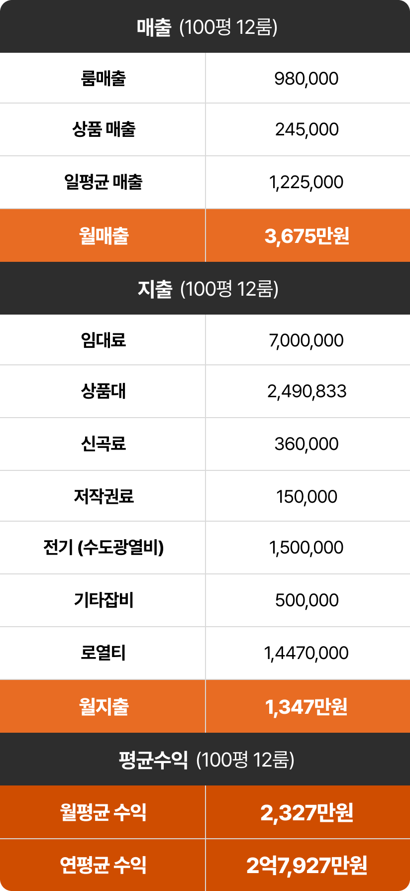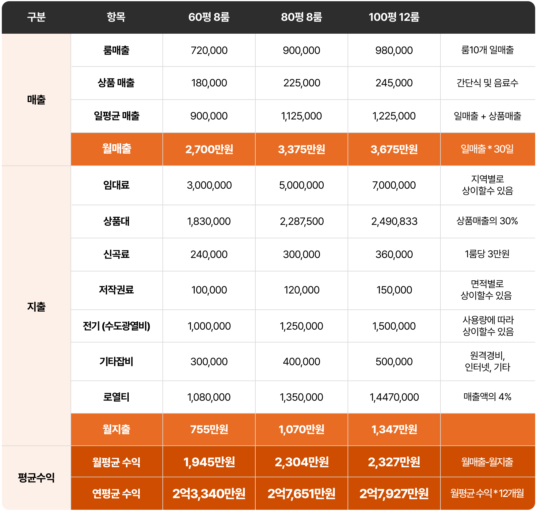 안정적인 월 매출과 검증된 수익률질러존 수익 구조 예시